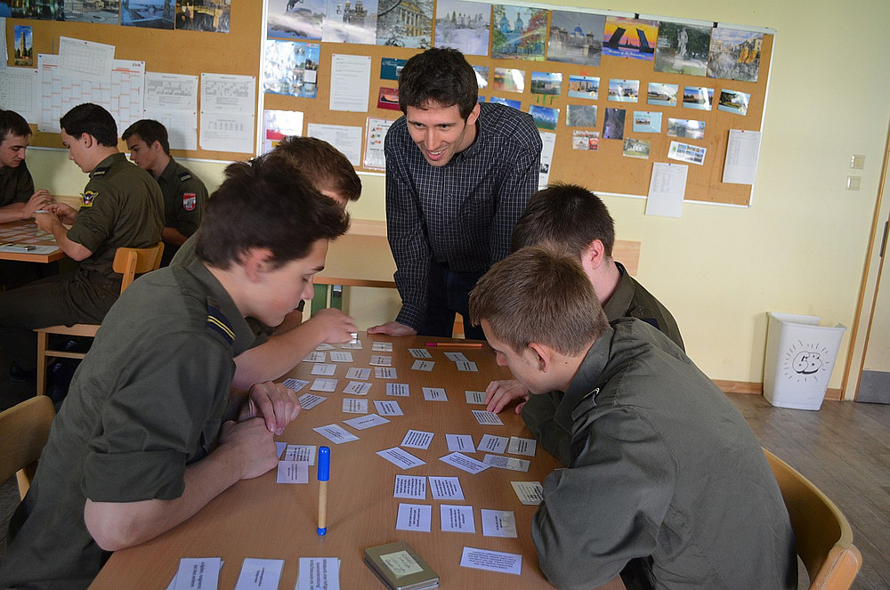 Am Samstag, dem 10.5.2014, waren die WortSchätze in Niederösterreich, und zwar am Militärrealgymnasium in Wr. Neustadt. Zwei sechste Klassen, wo die Schülerinnen und Schüler tatsächlich in Uniformen im Unterricht erscheinen, arbeiteten und diskutierten je zwei Stunden lang engagiert mit ihrem Workshopleiter Norbert Galler zum Themenbereich - wie könnte es an einem Militärgymnasium anders sein - Wehrkultur.